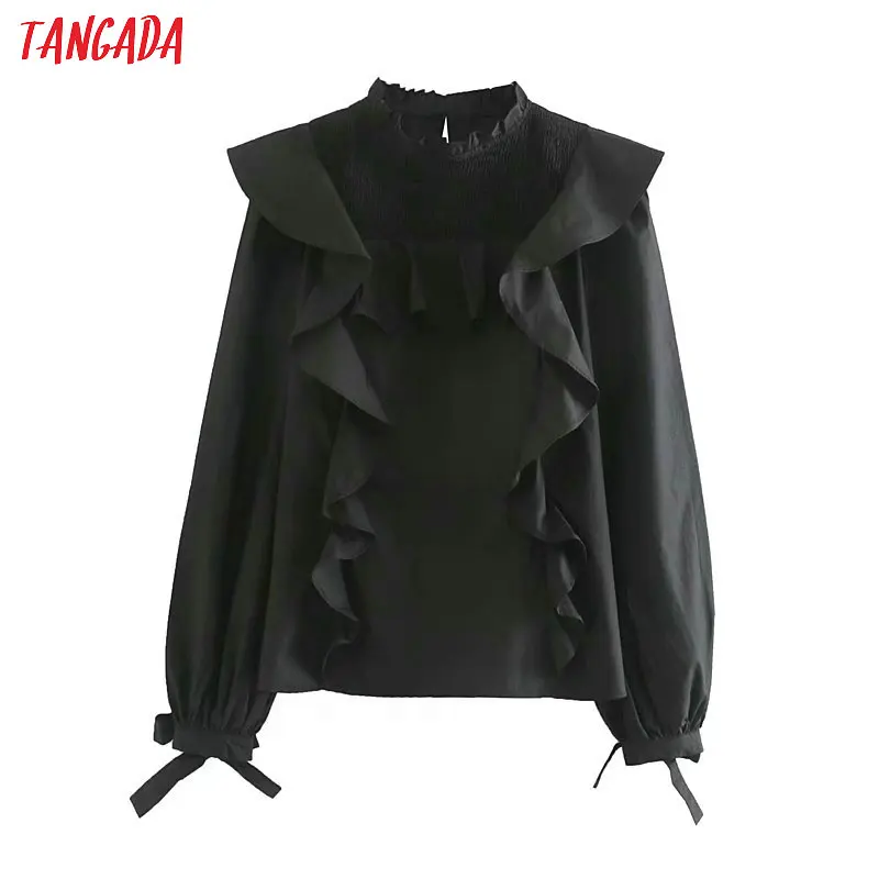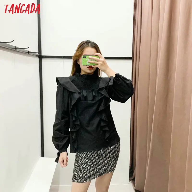 Special Offer Tangada mujer elegante volantes blusa negra manga larga cuello de pie vintage camisa femenina casual tapas blusa 4Q05 Discount 30% Today!