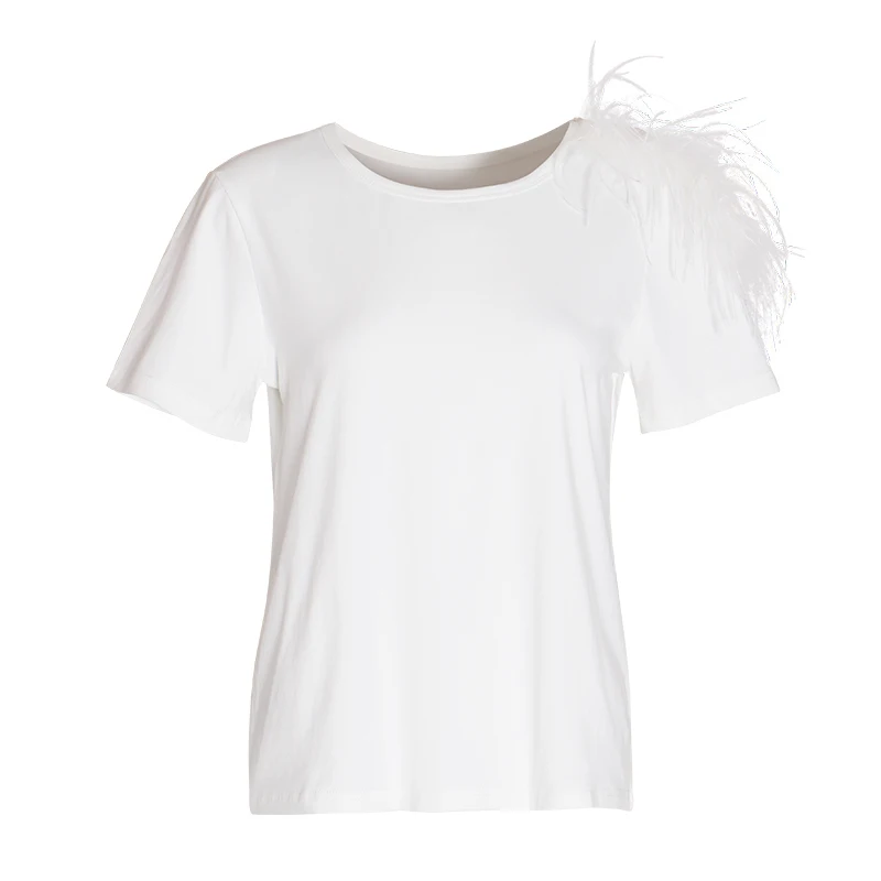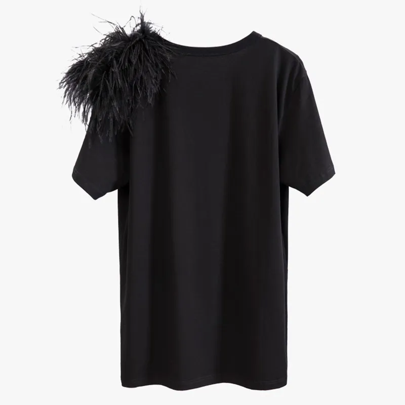 Special Offer TWOTWINSTYLE 2019 verano Casual negro camisetas femeninas cuello redondo manga corta Patchwork plumas mujeres camisetas elegante moda nueva Discount 39% Today!