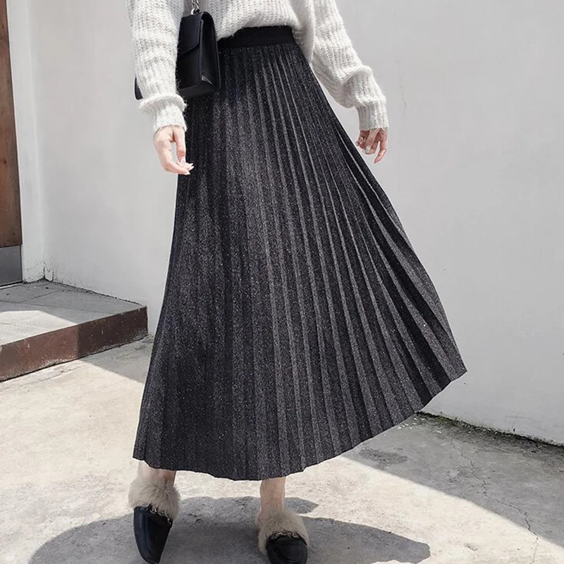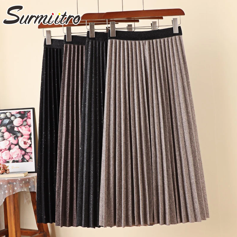 Special Offer Surmiitro brillante Falda plisada por debajo de la rodilla mujeres para Otoño Invierno 2019 señoras coreanas Casual de alta cintura negro una línea larga falda femenina Discount 40% Today!