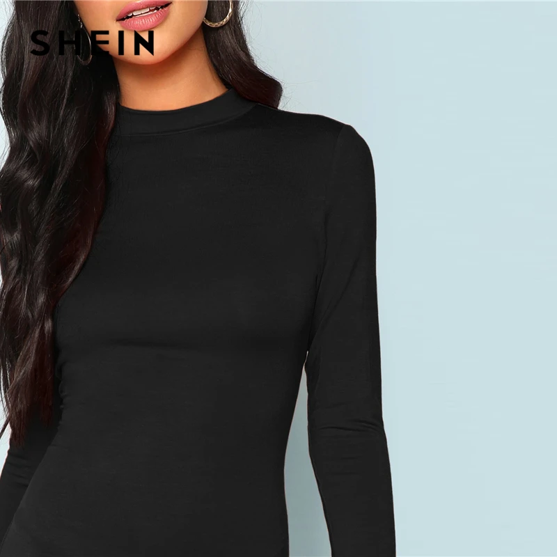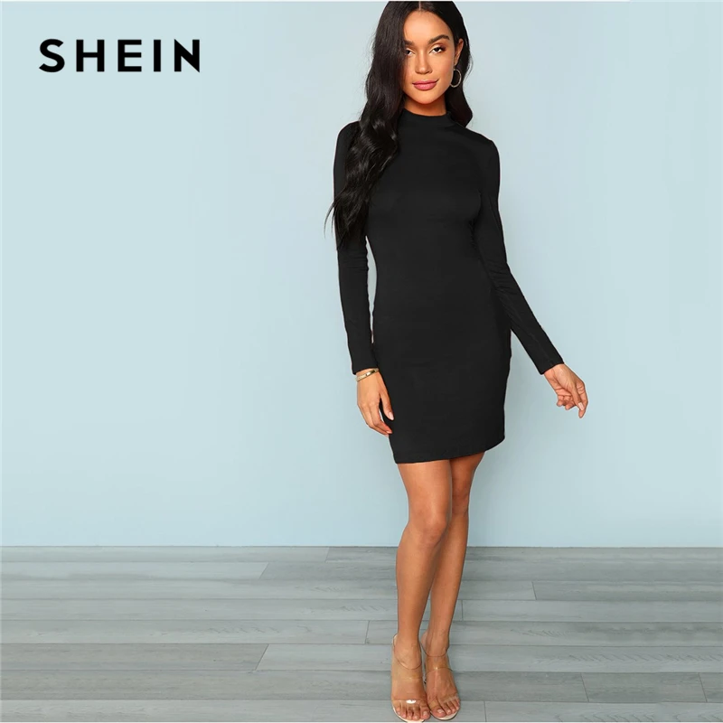Special Offer SHEIN negro elegante Oficina señora Mock forma de cuello ajustado manga larga sólido vestido Delgado otoño minimalista Moda Mujer Vestidos Discount 41% Today!