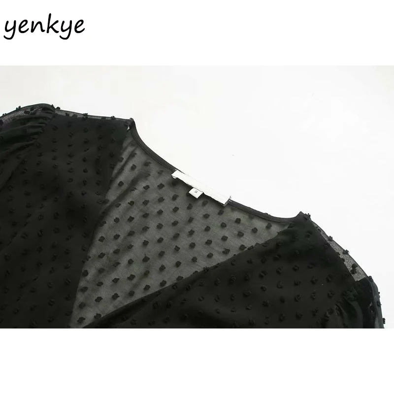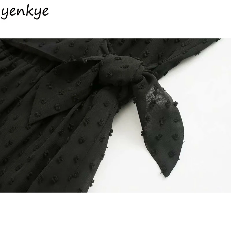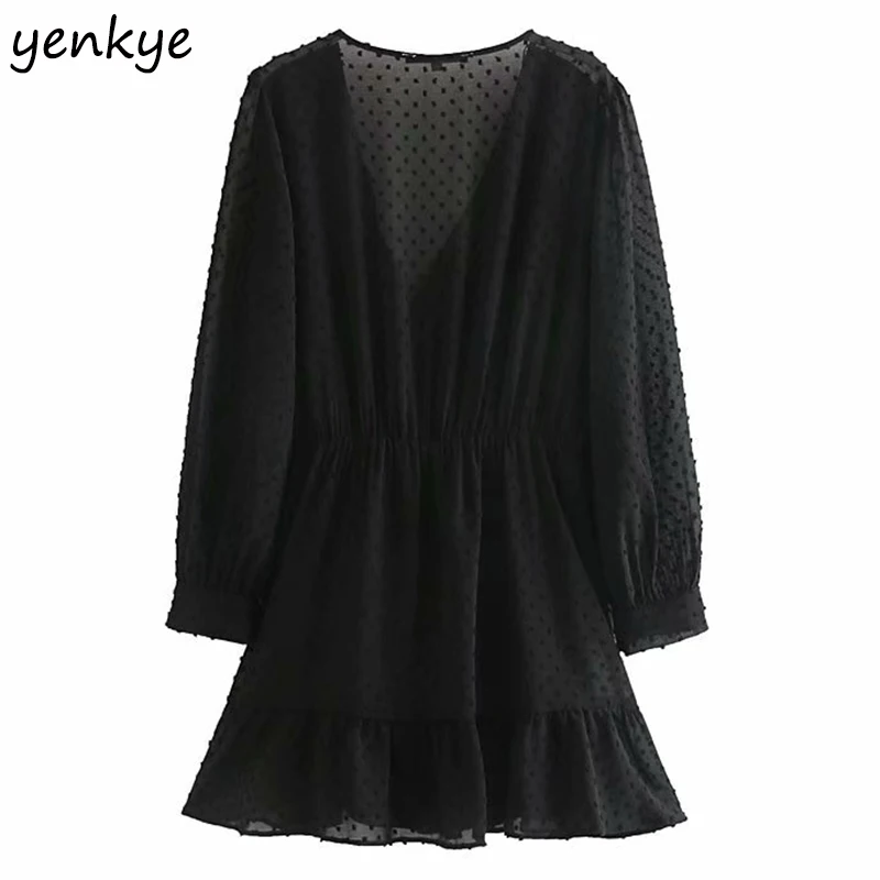 Special Offer Vintage negro punteado vestido de gasa mujeres de manga larga Cruz cuello V verano Vestidos cortos OZZ9380 Discount 43% Today!