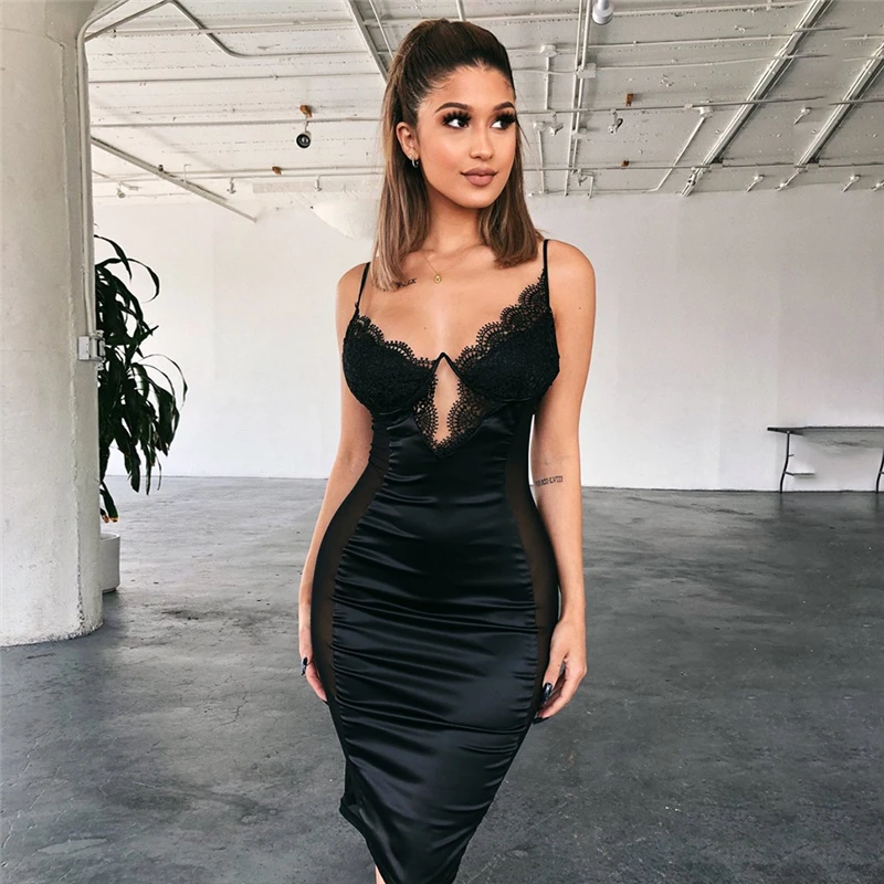 Special Offer Shestyle Lace 2019 verano otoño vestido de cuello en V mujeres sin espalda lado transparente negro ceñido al cuerpo vestidos de fiesta hasta la rodilla Discount 45% Today!