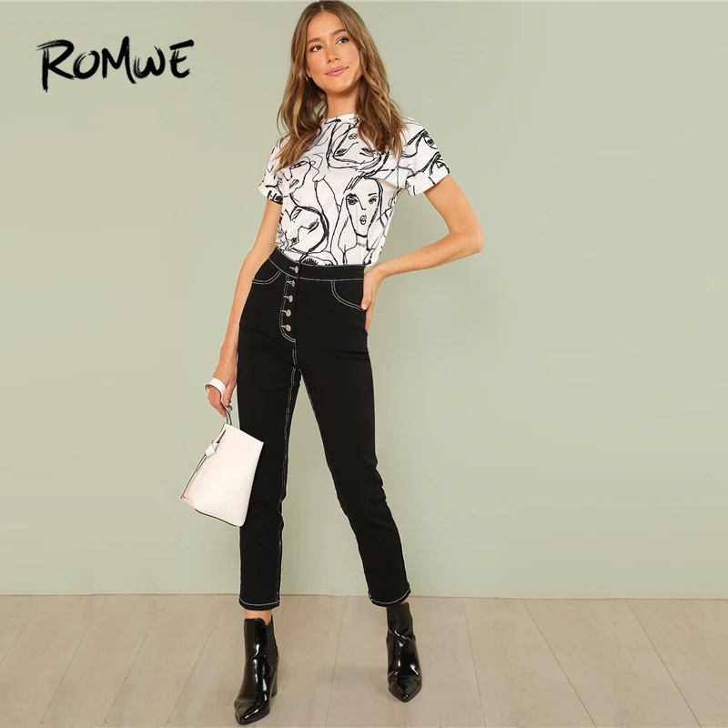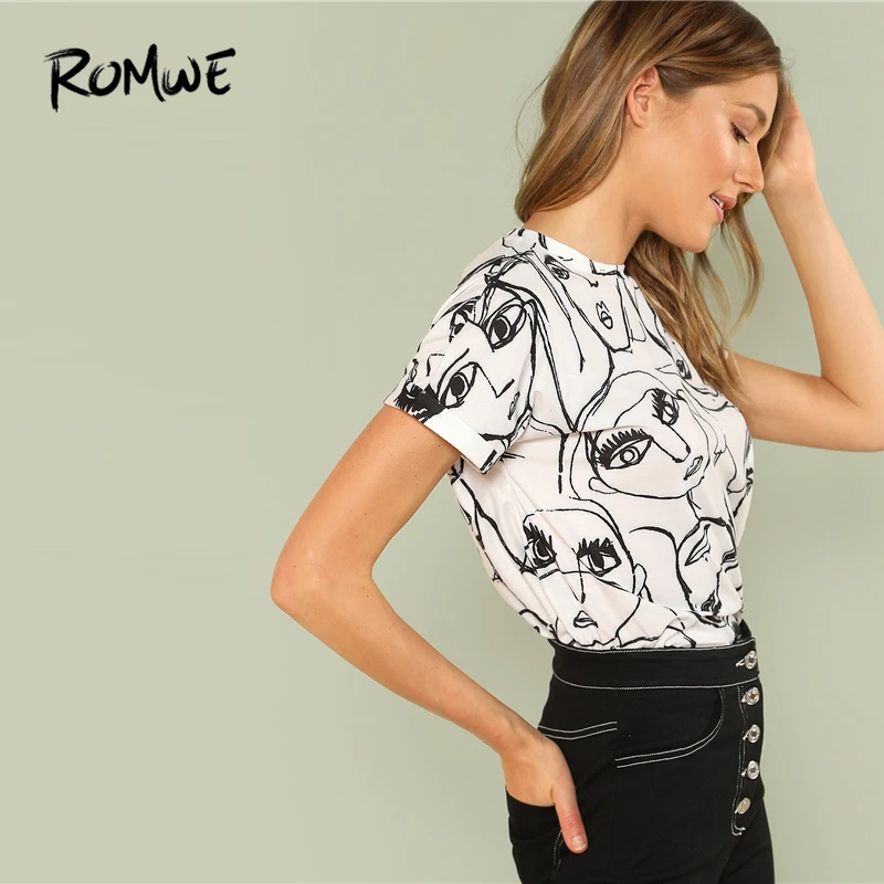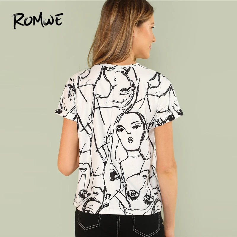 Special Offer Túnica con estampado de dibujos animados ROMWE 2019 Casual blanco y negro Verano de manga corta figura mujeres camiseta femenina Camisetas cuello redondo Discount 45% Today!