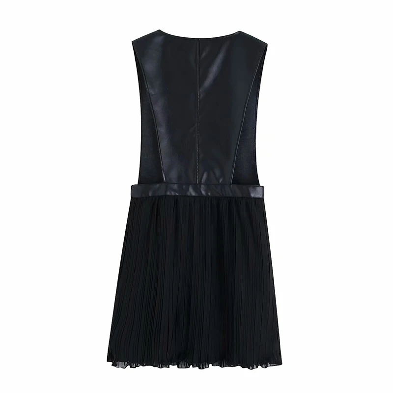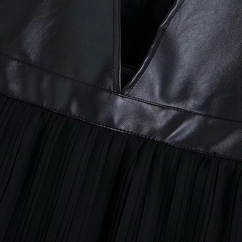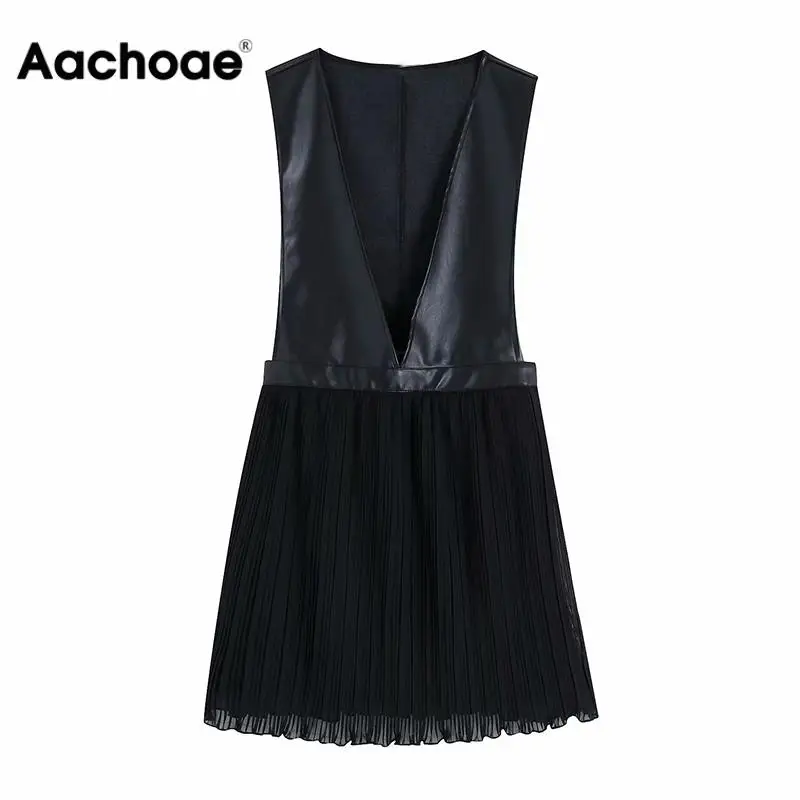 Special Offer Mujeres vestido sin mangas negro moda Deep V cuello Patchwork Pu cuero Mini vestido Vintage señoras vestido de fiesta plisado Mujer Vestdios Discount 47% Today!