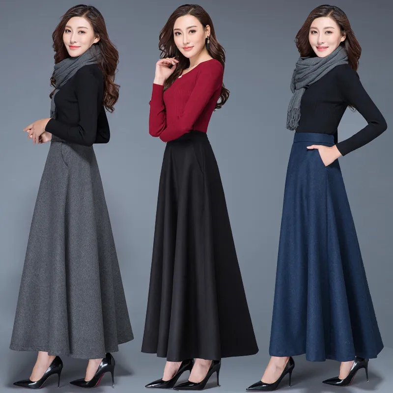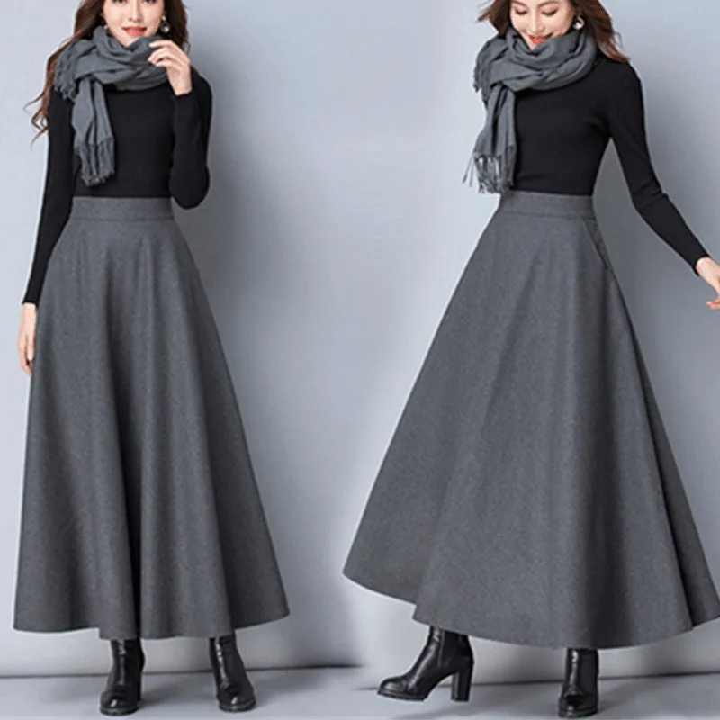 Special Offer 2019 nueva falda delgada de otoño para mujer falda de lana de invierno Casual negro gris rojo de cintura alta Falda plisada larga femenina XS 19 Discount 52% Today!