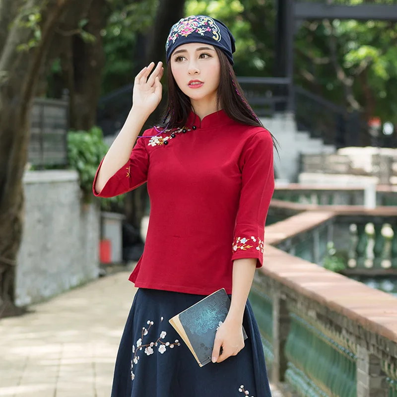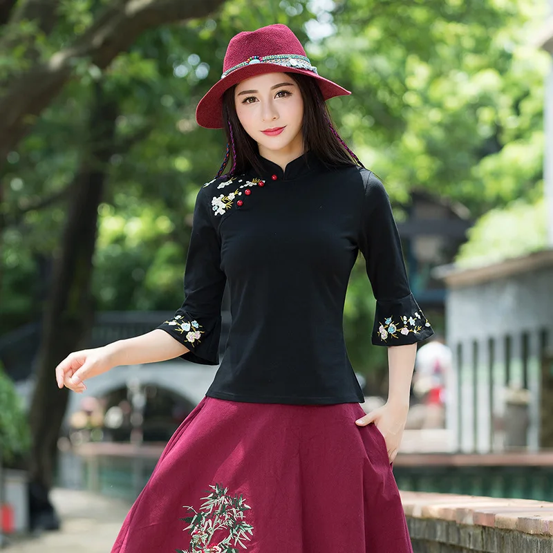 Special Offer KYQIAO ropa tradicional china 2020 de talla grande mujer ropa otoño femenino mandarín cuello negro bordado blusa Discount 0% Today!