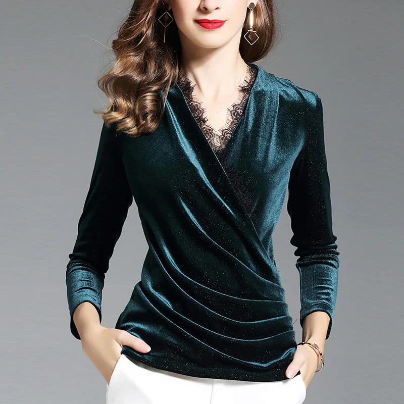 Special Offer Las mujeres de Moda de Primavera otoño retales de encaje azul negro Velour camisetas, otoño mujer delgada elegante plisado cuello en V terciopelo camiseta Discount 15% Today!