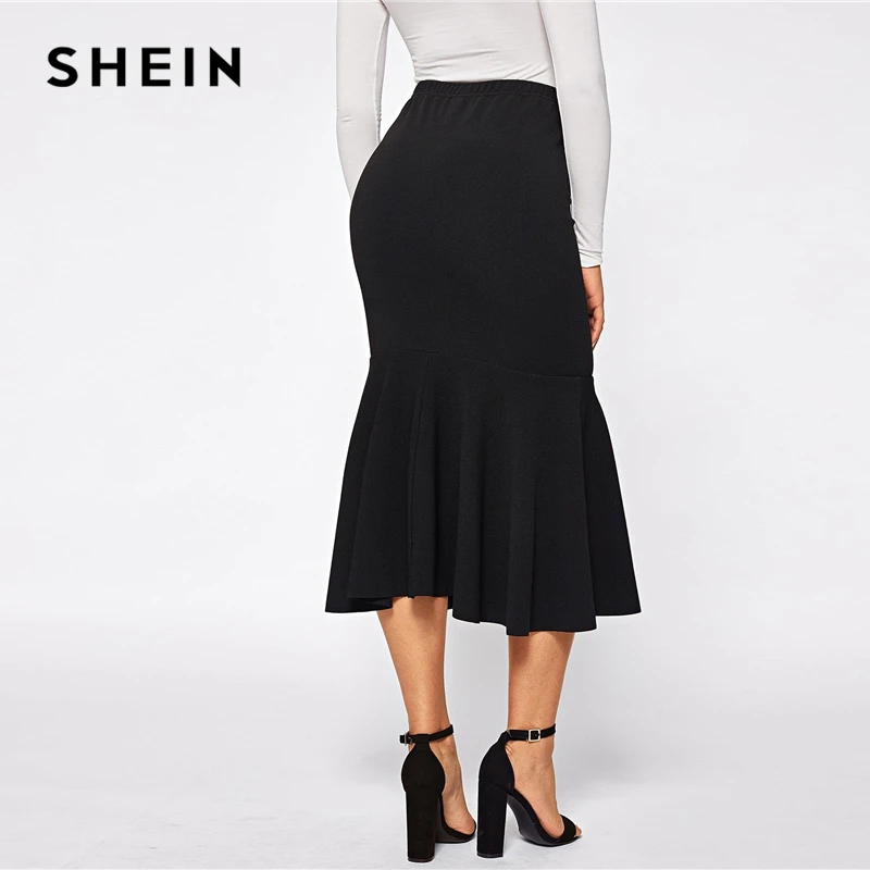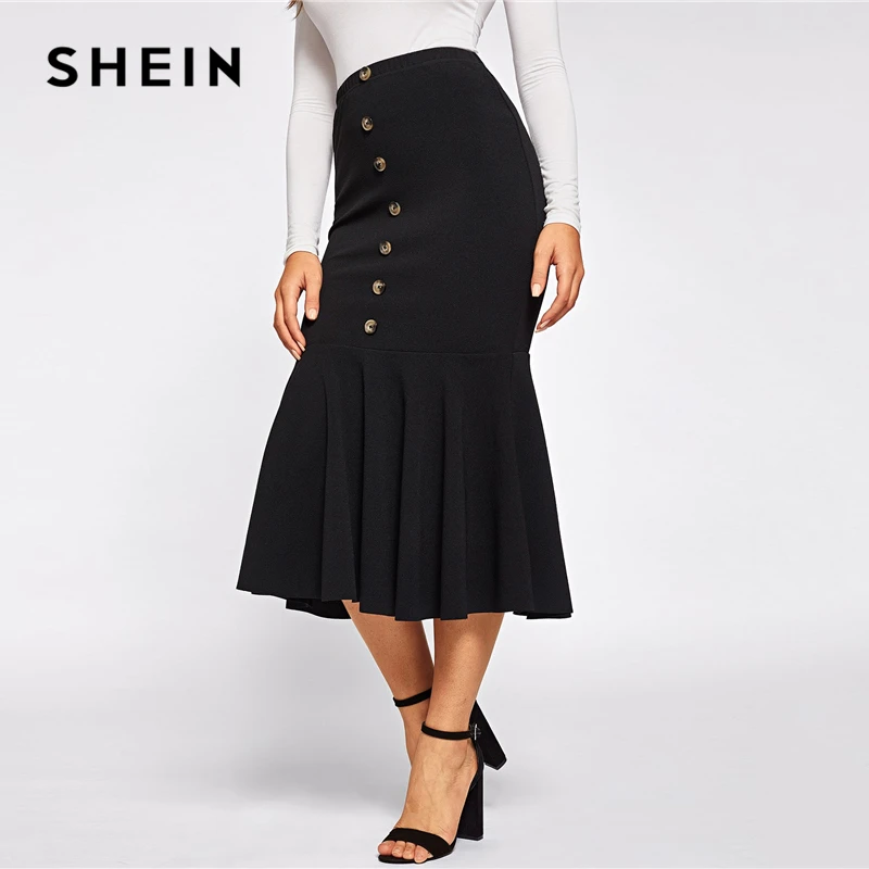 Special Offer SHEIN negro elegante botón frente Ruffle Fishtail Hem Falda larga Mujer primavera media cintura sólida Mermaid ropa de trabajo faldas ceñidas Discount 41% Today!