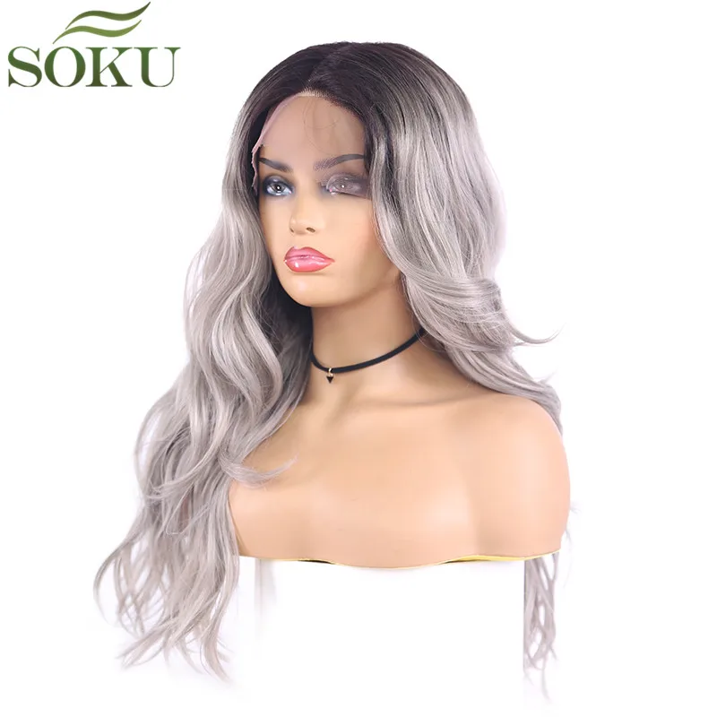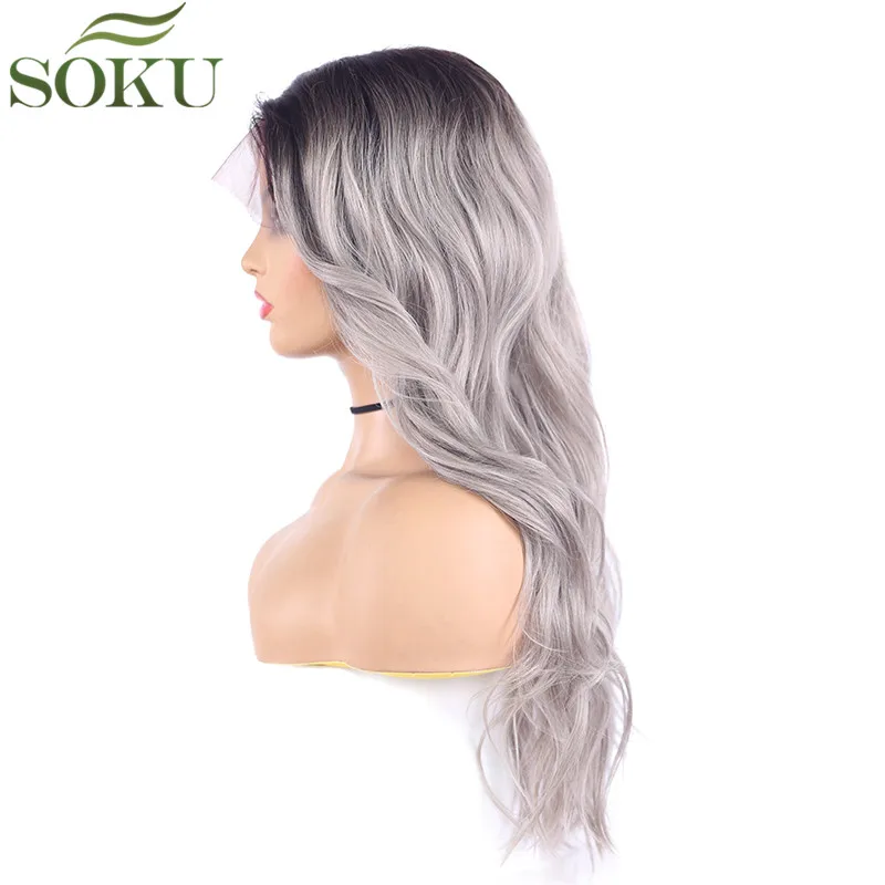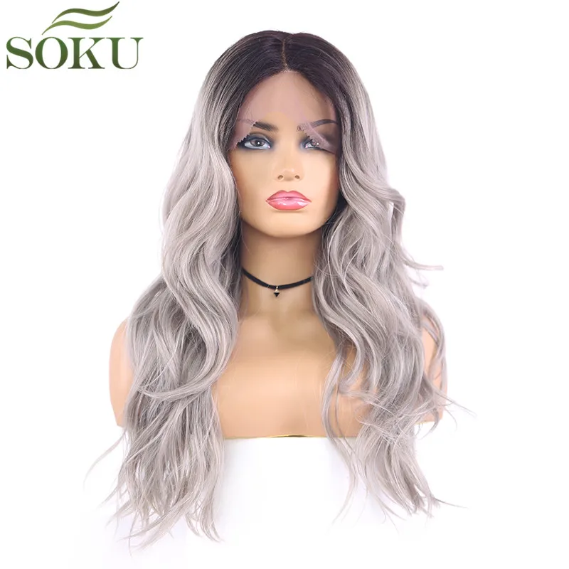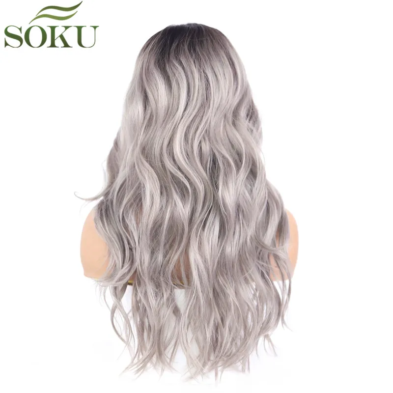Special Offer Pelucas delanteras de encaje sintético de SOKU para mujeres negras Peluca de 18 pulgadas de onda en forma de L Color gris Peluca de fibra de alta temperatura de 130% densidad Discount 44% Today!
