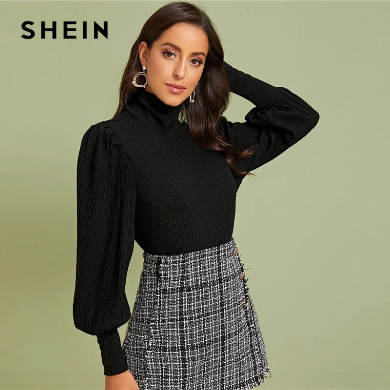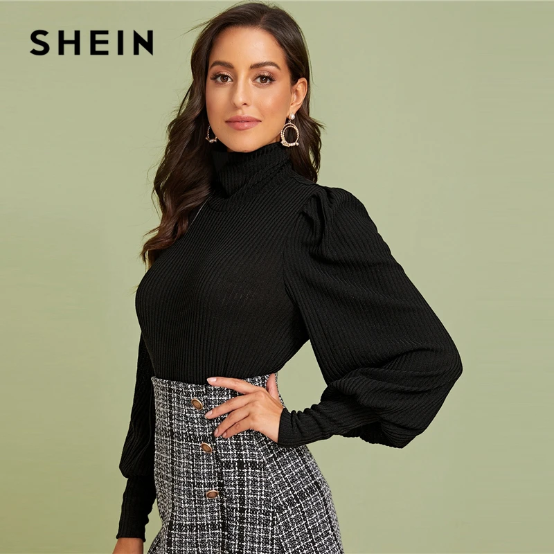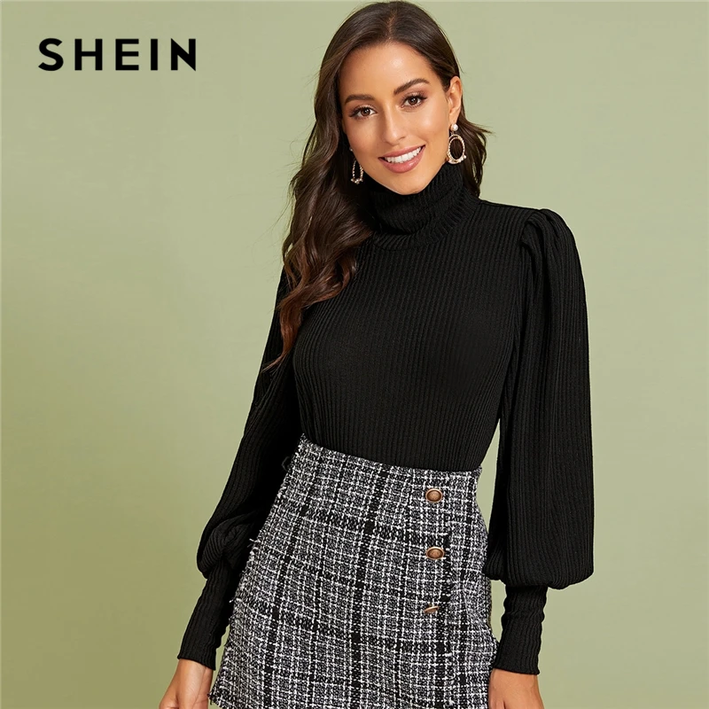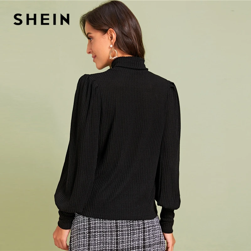 Special Offer SHEIN negro cuello alto acanalado punto playera elegante camisetas de otoño pierna de cordero manga sólida Oficina señoras Casual camisetas Discount 46% Today!