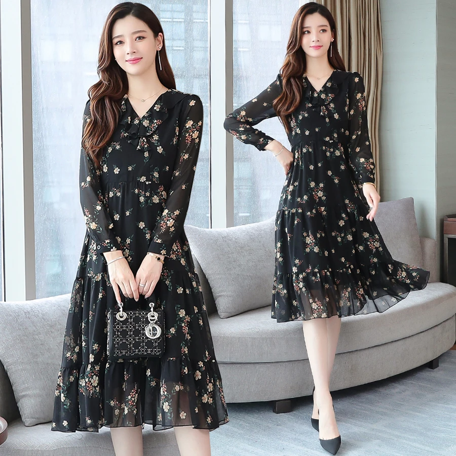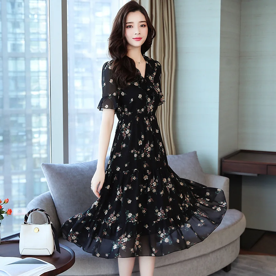 Special Offer Verano negro Vintage Floral gasa Midi vestido de verano 2019 mujeres elegantes de talla grande Boho Vestidos de fiesta Vestidos de pasarela de manga corta Discount 49% Today!