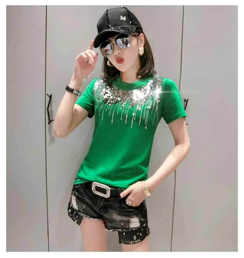 Special Offer Camiseta de cuello redondo con lentejuelas sólidas y diamantes 2019 nueva Camiseta de algodón para oficina de verano para Mujer Camiseta Mujer blanco negro T95107L Discount 30% Today!