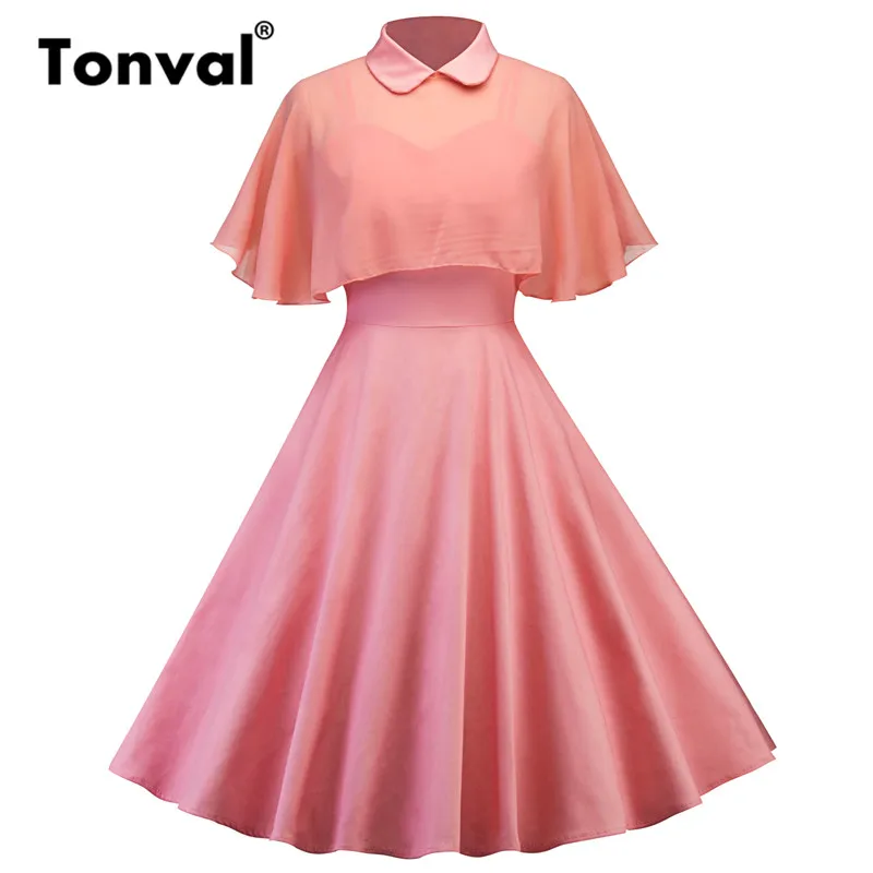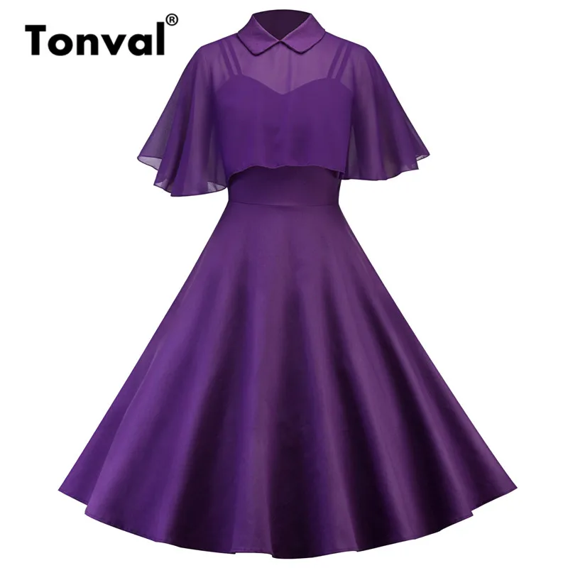 Special Offer Tonval Rockabilly Vintage dos piezas vestido negro capa de gasa una línea Pin up vestidos mujeres capa mangas fiesta vestido Midi Discount 30% Today!