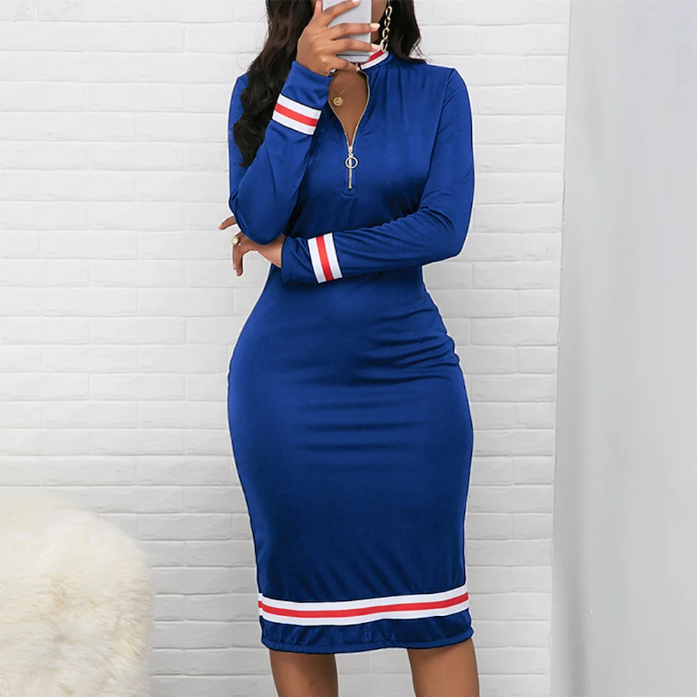 Special Offer Vestido de cuello alto con cremallera a rayas para dama negro de manga larga para mujer vestido ajustado de otoño hasta la rodilla oficina trabajo lápiz vestido Midi Discount 30% Today!