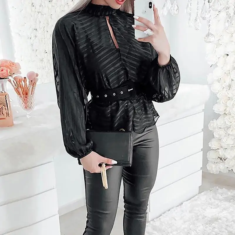 Special Offer Blusa elegante básica negra informal para mujer con estilo OL trabajo superior rayas cerradura frontal blusa de malla blusas mujer de moda 2019 Discount 33% Today!