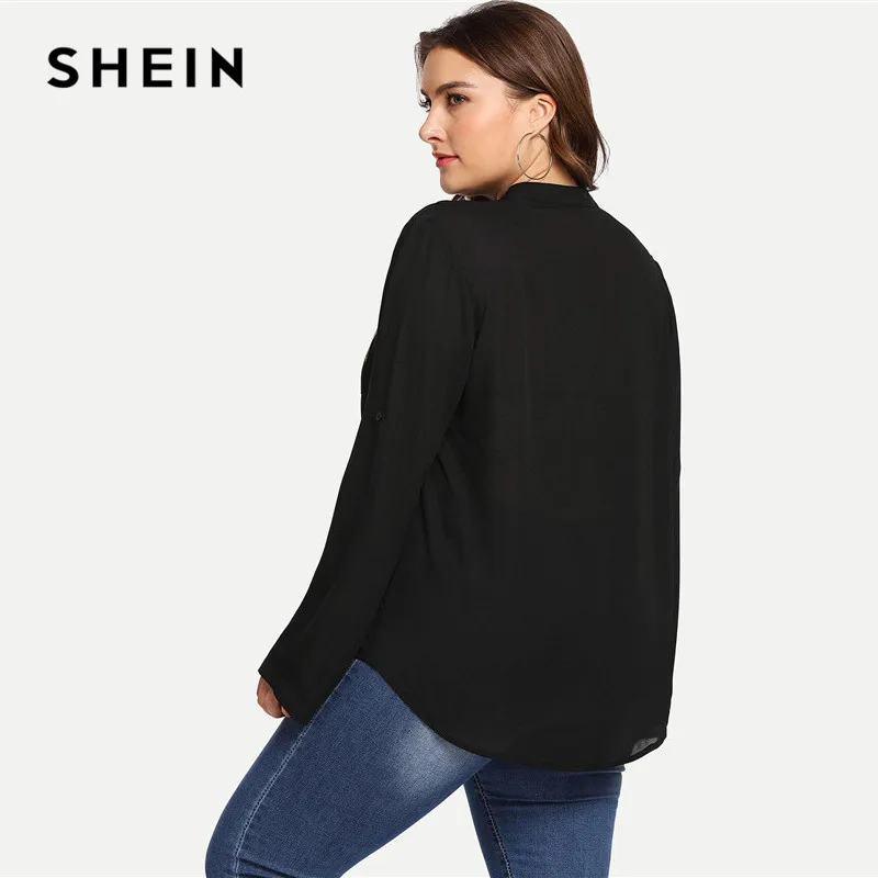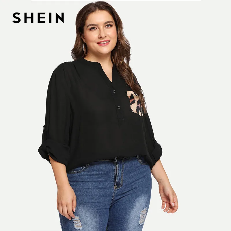 Special Offer SHEIN negro leopardo estampado bolsillo parcheado Roll Tab manga cuello V Oficina señora blusas de talla grande mujer Casual medio Placket camisas Discount 41% Today!