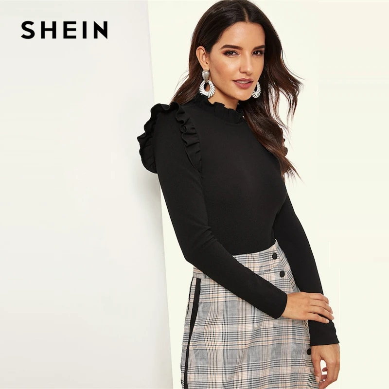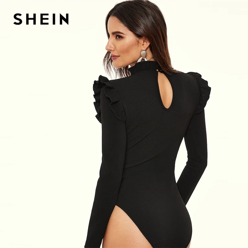 Special Offer SHEIN negro Collar con detalle de volante de Slim equipado Skinny body liso de manga larga de las mujeres de la primavera de 2019 Mediados de cintura Bodies Discount 41% Today!