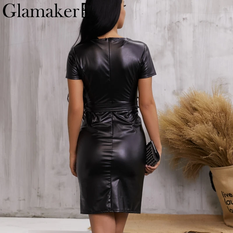 Special Offer Glamaker de cuero PU cuello en v sexy ceñido al cuerpo vestido de mujer de alta cintura para fiesta midi vestido elegante femenino otoño botón negro club vestido Discount 43% Today!