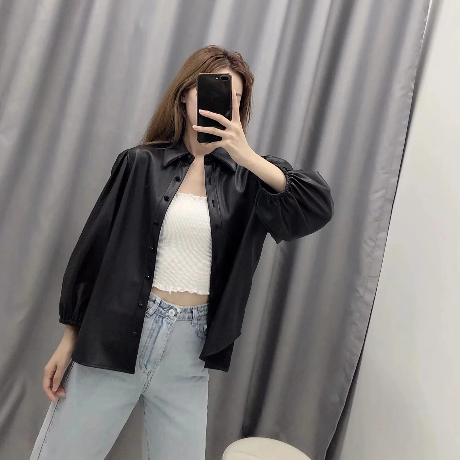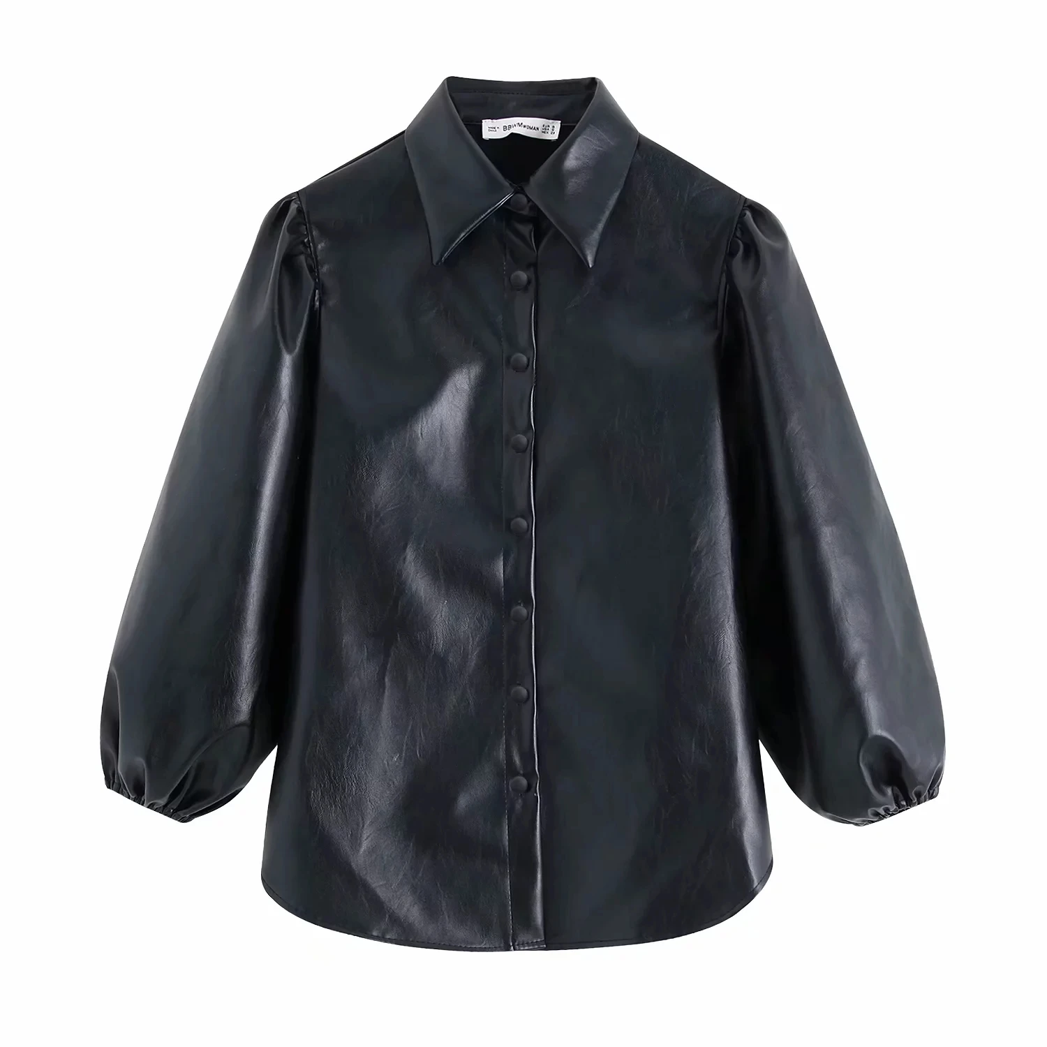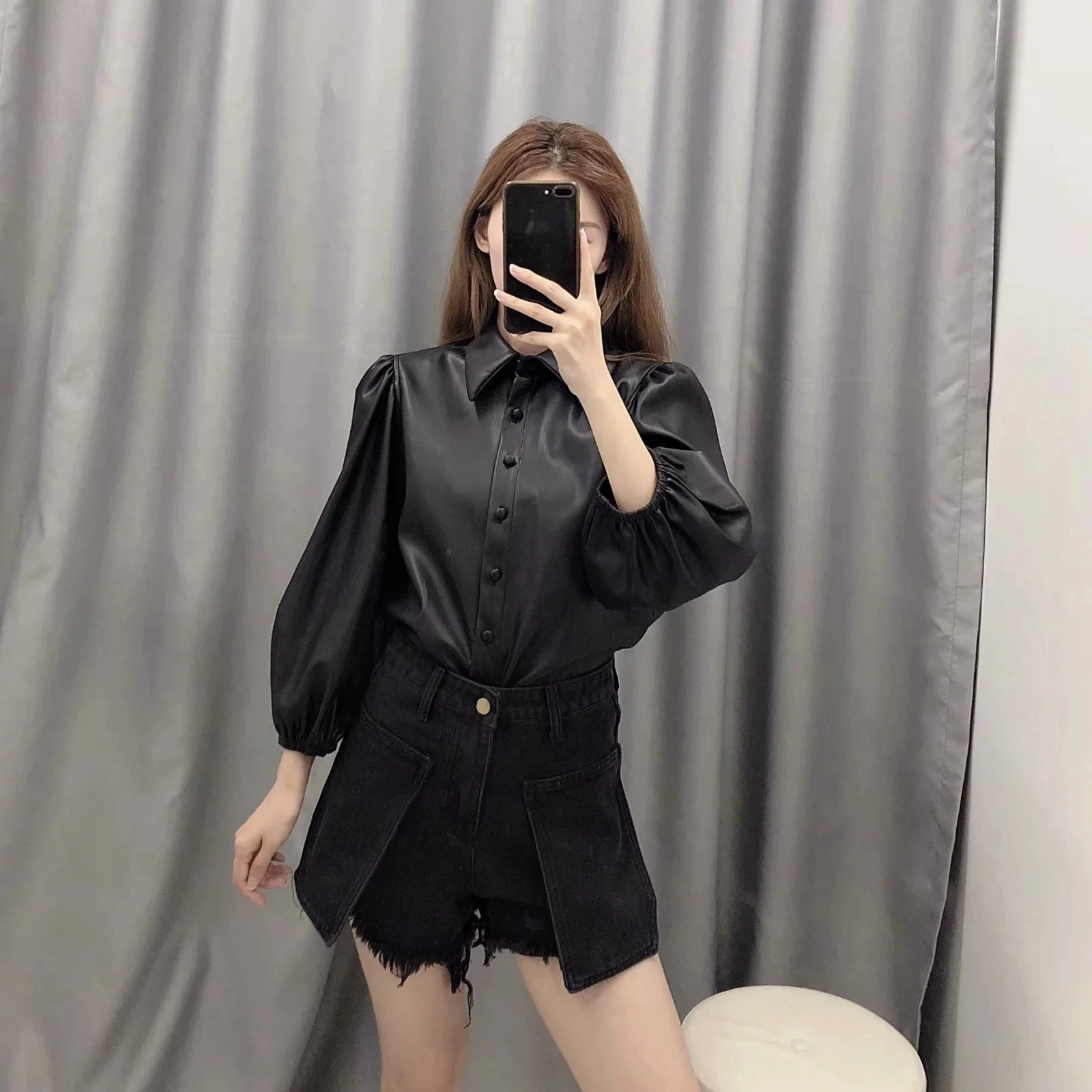 Special Offer Vintage negro PU faux cuero mujer Blusas coreano puff manga camisas mujeres tops y Blusas streetwear 2019 Camisa Blusas Discount 45% Today!