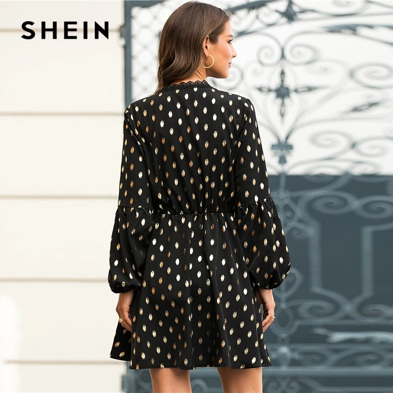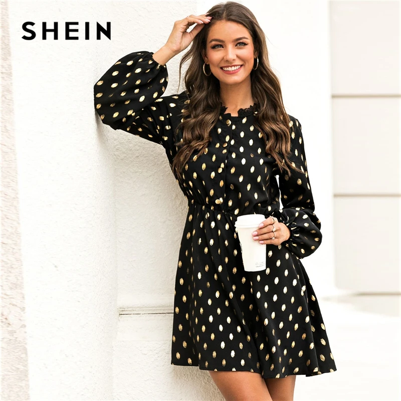 Special Offer SHEIN negro dorado Polka Dot contraste encaje vestido mujer primavera abotonado alta cintura de manga de obispo señoras elegantes vestidos cortos Discount 46% Today!